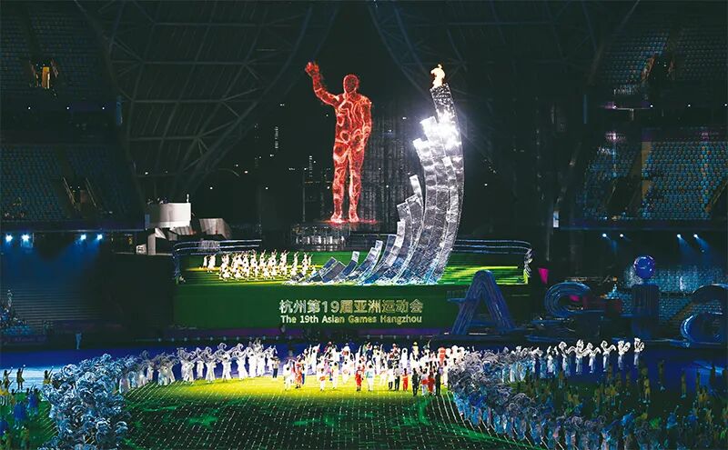 党的十八大以来,在习近平新时代中国特色社会主义思想指引下,我国各项事业取得历史性成就、发生历史性变革。在刚刚闭幕的杭州第19届亚洲运动会上,从首创“亚运数字火炬手”到推出电子身份注册卡、探索使用5.5G新技术……数字赋能、科技助力,让世界看到了中国的科技实力和东方文化的魅力。图为2023年10月8日,在杭州亚运会闭幕式上,数字火炬手“弄潮儿”向现场观众挥手致意。 新华社记者 王鹏/摄